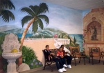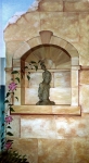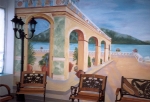 This is a dentist office which the client wanted the illusion of dept and distance in a very classic environment. He had a real fountain placed in the middle of the wall along with benches and chairs and I was to design my mural incorporating those pieces. The whole scene takes place on this magnificent palace terrace overlooking the ocean. This is a mural that was designed "around existing furniture". It works.