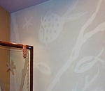 This kind of decorative finish is so delicate and subliminal. The idea here was to recreate the etched glass design of the waterfall onto the back wall so that when the light hits the water dribbling down the glass the back wall comes to life. This effect can be done with any color and it's a wonderful soft look on the wall that is very subdued.
